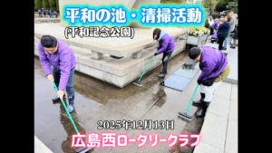 2025.12.18クリスマス家族同伴例会 2026 3/04 【動画一覧】 2026年1月5日2026年3月4日 恒例の広島西ロータリークラブ家族同伴例会です。 このサイトでは動画の視聴のみ可能です。チャンネル登録はYouTubeページから行えます。 今後の動画も見逃さないために、ぜひご登録ください。 下のボタンを押すとYouTubeが開きます。 YouTubeチャネル登録はこちら YouTube内でGoogleアカウントにログインいただくと、スムーズにチャンネル登録ができます 【動画一覧】 平和の池・清掃活動 2026.2.15国際ロータリー第2710地区グループ6・7合同インターシティミーティング 関連記事 2026.2.15国際ロータリー第2710地区グループ6・7合同インターシティミーティング 2026年2月20日 平和の池・清掃活動 2025年12月23日 2025-26年度国際ロータリー第2710地区地区大会 2025年10月24日 2025年9月11日(木)職場訪問例会 2025年9月21日 2025年7月17日夜間例会並びに会員懇親会 2025年7月31日 創立55周年記念事業平和の池多言語説明板リニューアル 2025年6月16日 姉妹クラブ・台南ロータリークラブ歓迎会 2025年4月11日 広島西ロータリークラブ創立55年記念式典・祝賀会 2025年3月18日